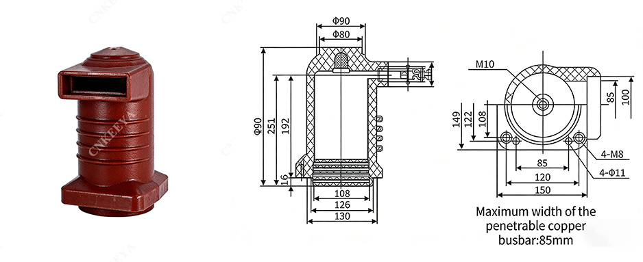 CNKEEYA, CH3-10Q/150 630~1250A Boîte de contact d'armoire de commutation montée au milieu, une usine réputée et un fournisseur de confiance, est fière de présenter le CH3-10Q/150, une boîte de contact de qualité supérieure conçue exclusivement pour les armoires de commutation montées au milieu. En tant que composant principal fabriqué par l'usine de fabrication avancée de CNKEEYA, cette boîte de contact (courant nominal 630 ~ 1 250 A, tension nominale 12 kV) est méticuleusement produite avec un composite de résine époxy haute performance et moulée avec précision grâce à des processus de production intelligents de pointe, offrant une protection d'isolation inégalée et une fiabilité sans compromis dans les systèmes de transmission de puissance. Conçu pour remplir les fonctions critiques d'isolation électrique, de connexion de contact statique-dynamique et de conduction de courant stable, le CH3-10Q/150 présente l'engagement de CNKEEYA envers l'excellence technique : avec un niveau de décharge partielle ≤ 3 PC à 13,2 kV, une tension de tenue à la fréquence industrielle de 42 kV (1 min) et une tension de choc de foudre de 75 kV, et atteint le niveau de protection IP67 pour résister à l'humidité, à la poussière et aux agents corrosifs.